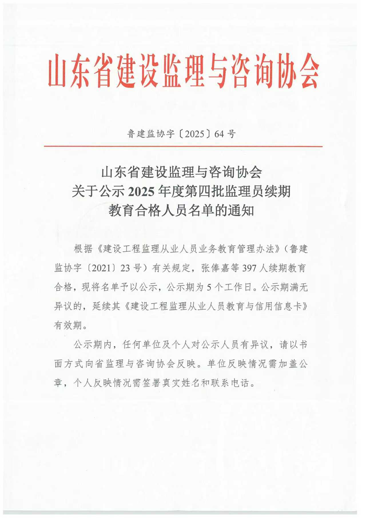 关于公示2025年度第四批监理员续期教育合格人员名单的通知