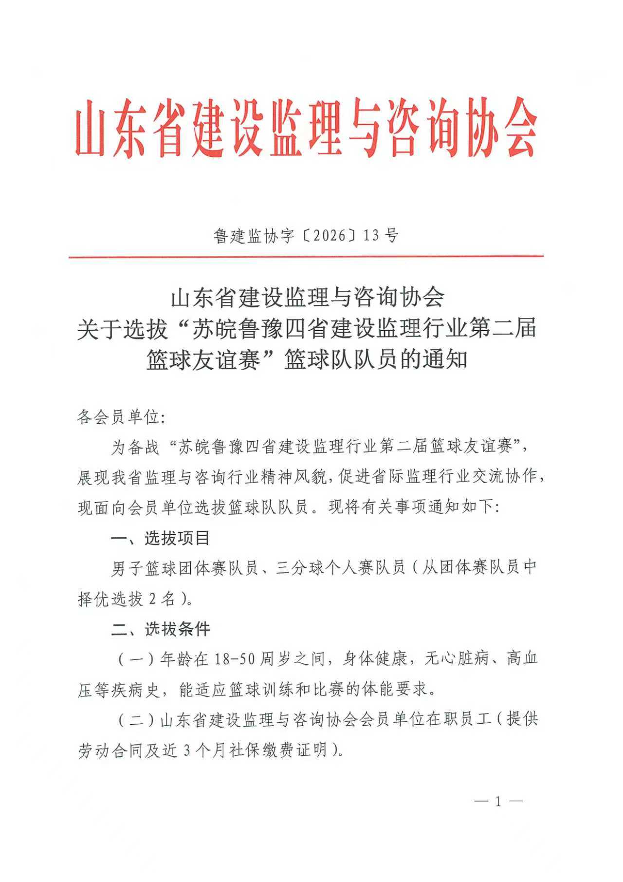 关于选拔“苏皖鲁豫四省建设监理行业第二届 篮球友谊赛”篮球队队员的通知 Thu, 19 Mar 2026 10:01:28 +0800