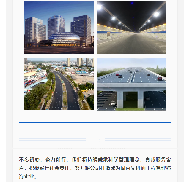 <p style="text-indent:2em;">  <span style="font-size:14px;color:#666666;line-height:2.5;">打造&ldquo;恒信监理&rdquo;品牌,建设具有公信力的工程技术咨询企业,将是公司全体员工始终不懈的追求。</span>  </p>
